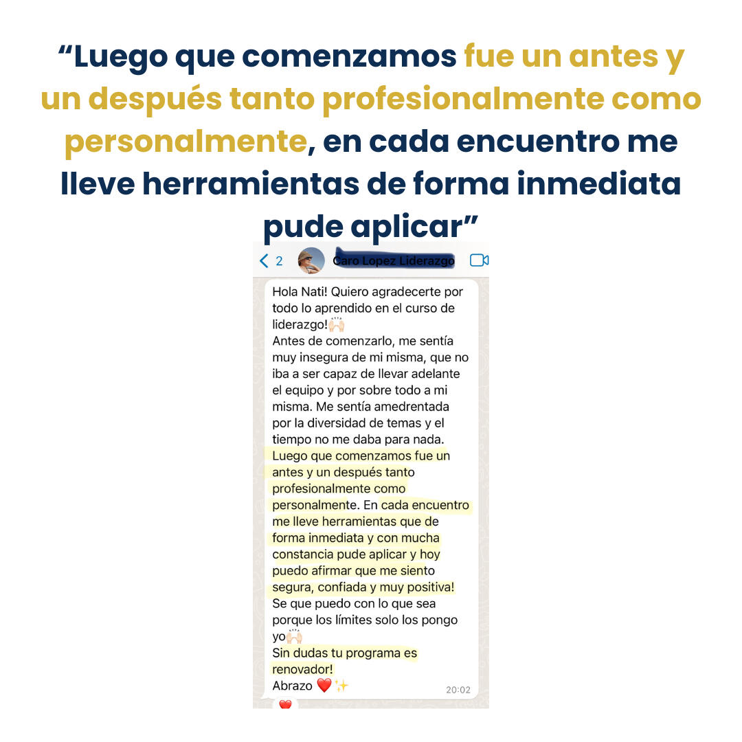 ⚡ De sentir que "no eres buena líder" o que "no estás a la altura de ese cargo" a confiar en tus capacidades y habilidades para potenciarte en ese rol.⚡ De no saber como manejar tu estrés, molestia, enojo ante determinadas situaciones a saber exactamente que herramientas puedes aplicar para que eso no te afecte.⚡ No saber cual es tu estilo de liderazgo ni cual es mejor usar según la situación a conocer perfectamente cual es tu estilo y cuales otros vas a aplicar según sea necesario.⚡ No saber como delegar e intentar hacer todo sola como si estuvieras en un puesto operativo a lograr un equipo autónomo que no dependa de ti para cada acción, esto no solo te libera tiempo, sino que energía.⚡ No saber que colaborador incorporar a tu equipo a saber exactamente las preguntas por competencias que les vas a hacer para tener al mejor candidato y eso no es todo, te voy a pasar "tips" que valen oro en la contratación de personal.⚡ Tener un equipo desmotivado o con poco compromiso a implementar estrategias para lograr un trabajo en equipo con una cultura de compromiso y sentido de pertenencia.⚡ No animarte a dar feedback por miedo a que se lo tome a mal la persona a saber el paso a paso para hacerlo de manera efectiva.